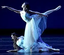 The work can be considered a bridge between his two early works for Sergei Diaghilev and his later, less episodic American works.[5] The dance is characterized by two falls, a choreographic allusion to Giselle, but also an element in the Khorumi, a Georgian folk dance which influenced Balanchine.[5] While Serenade is one of Balanchine's infamous plotless ballets, many elements of the dance seem to point towards a loose form of a story. As dancers came and went during the rehearsal process, Balanchine choreographed their entrances and exits into the piece. At the beginning of rehearsals, Balanchine started with seventeen young women, reflected in the opening scene of the ballet. The next rehearsal there were only nine women present and then six, so he choreographed the following scenes with those numbers of dancers. Male students began to attend the rehearsals and so they were choreographed in, and the late arrival of one woman was also included.[6] While plotless, Serenade reflected the ups and downs of choreographing a ballet, and made the humanity of the dancers clear when he choreographed their real-life mistakes into the finished product.