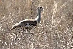 One of Serendip Sanctuary's initial breeding programs included the reintroduction of the Australian bustard (Ardeotis australis).[19] The program launched in the 1960s to study, breed and reintroduce the fallen Australian bustard populations. Serendip Sanctuary was used to recreate the bustard's natural lek mating system in captivity.[19] In lek mating systems, male bustards defend small clustered areas that female bustards visit for the purpose of mating.[19][20] In such systems, males are confined together at specific sites for display, where females visit to select their mating partner.[20] Researchers at Serendip Sanctuary recreated the lek mating system in captivity by constructing an enclosure that allowed female bustards to enter and select a male mating partner, but separated the males from direct contact.[20]