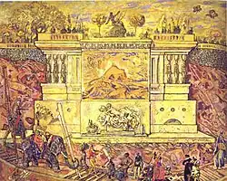 Sergey Ivanovich Kalmykov (Russian: Серге́й Иванович Калмыков; 6 October 1891 – 27 April 1967) was a Soviet painter, draughtsman, and writer. Barely known during his art career and abandoned at the end of his life, he is currently regarded as one of the most important figures of the Russian avant-garde art, an author of over fifteen hundred of paintings, drawings, illustrations, theater decorations, and numerous writings. During his life Kalmykov has developed an original style of painting and draftsmanship that can be described as 'magical impressionism'.