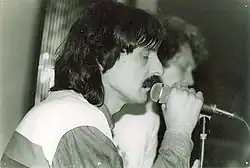 The band Atomsko Sklonište was formed in 1977 on the idea of poet Boško Obradović, who aspired to form a band which would perform songs featuring his anti-war lyrics.[1] Blažić was the member of the band since its formation.[1] The group attracted the attention of the public with their anti-war concept and cataclysmic imagery,[1] and gained large mainstream popularity with the release of their debut album Ne cvikaj, generacijo (Don't Be Afraid, My Generation) in 1978.[1] The group maintained their popularity with their live performances and following studio albums, scoring a number of hit songs.[1] Blažić recorded seven studio albums with the band, including the English language album Space Generation for the foreign market, as well as two live albums.[1] In 1985, he took part in the YU Rock Misija project, a Yugoslav contribution to Live Aid, contributing vocals to the song "Za milion godina".[2] He had his last performance with the band on 21 July 1986 in the Pula club Uljanik.[1]