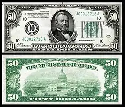 Series of 1928 United States Notes were issued in $2 (through 1928G) and $5 (through 1928F) denominations until the early 1950s.[4] Also, for a brief period in 1933, Series of 1928 $1 United States Notes were issued as a response to the Great Depression. Most of these remained in storage before being released in Puerto Rico during 1948-9.[5]