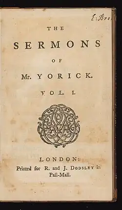 A collection of Sterne's sermons was published after he achieved fame with his comic novel Tristram Shandy, which was first published at Sterne's expense in December 1759.[22][23][24] Within the novel, a character reads Sterne's previously-published sermon "Abuses of Conscience" (attributed to the character Mr. Yorick, who generally served as Sterne's alter ego) with comic interruptions and running commentary.[21] Sterne included a note: "in case the character of parson Yorick, and this sample of his sermons is liked [...] there are now in the possession of the Shandy Family, as many as will make the world a handsome volume, at the world's service,--and much good may they do it."[25] The novel and its sermon were both immediately popular; the author Horace Walpole wrote in one of his letters that "nothing is talked of, nothing admired" but Tristram Shandy, and "[t]he best thing in it is a sermon".[25]