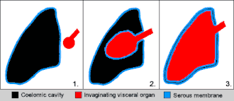 The serous cavities are formed from the intraembryonic coelom and are basically an empty space within the body surrounded by serous membrane. Early in embryonic life visceral organs develop adjacent to a cavity and invaginate into the bag-like coelom. Therefore, each organ becomes surrounded by serous membrane - they do not lie within the serous cavity. The layer in contact with the organ is known as the visceral layer, while the parietal layer is in contact with the body wall.