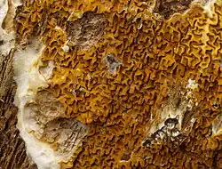 Serpula himantioides is a fungal pathogen within the division Basidiomycota. It produces thin, resupinate (inverted), membranous fan-like basidiocarps that are brownish in color and appear as distinctive fruiting bodies on the exterior of the host. S. himantioides prefers the moist wood of coniferous hosts such as fir, larch, spruce, and pine. It is the causal agent of butt rot disease, the symptoms of which include rotting the heartwood at base of tree, as well as damage to the tap root and cores of lateral roots, but standing trees show no signs of infection.[5] It also a common cause of timber rotting in buildings, which has made this pathogen difficult to differentiate from S. lacrymans because of their similarities.[6][7] This disease often goes unnoticed initially due to a lack of any above ground symptoms of disease. Signs of the pathogen include basidiospores, and fungal masses that are generally dark brown and membranous in the center but become thin white mycelium towards edges of the mass. The brown cubical rot caused by S. himantioides resembles the rots of Phaeolus schweinitzii and S. lacrymans.[5]