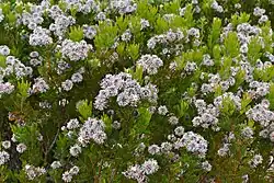 The shrub is erect and round and grows only 1.5 m (4.9 ft) tall. It bears silver-pink flowers from July to October.[2] Fires in the summer destroy the plant but the seeds survive. Two months after flowering, the fruit falls off and ants disperse the seeds. They store the seeds in their nests. The plant is bisexual. It is pollinated by insects.