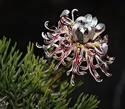 Serruria gremialis, the Riviersonderend spiderhead, is a flowering shrub that belongs to the genus Serruria and forms part of the fynbos. The plant is endemic to the Western Cape and occurs in the Riviersonderend and Stettynkloof mountains. The shrub is predominantly a creeper with stems growing up to 1.0 m in length and flowering from July to February.