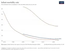 In 2020, 10.6% of total government expenditure in Portugal is allocated to health, in comparison to 10.9% in the European Union.[15] This value has a direct relation with the reduction of child and infant mortality rate, maternal ratio, improvement of the national healthcare system, allowing it to be free, universal and accessible to all residents in Portugal.[16]