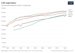 Life expectancy in Portugal has improved significantly over the years. The latest data from the World Health Organization (WHO) indicates an average of 81.2 years for all the population.[1] The overall for women is 83.9 years and 78.3 years for men.[1]