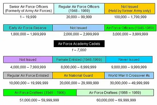 Significant United States Air Force service numbers include:[2]