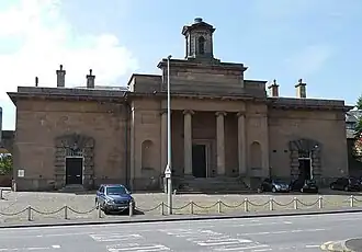 The new building was designed by George Moneypenny in the neoclassical style, built in ashlar stone and was completed in 1818.[1] The design involved a symmetrical main frontage of five bays facing on Toft Road. The central section of three bays featured a tetrastyle portico formed by four Ionic order columns supporting an entablature, a cornice and a parapet. The portico was flanked by narrow bays contained niches, while the outer bays contained doorways (one door for the nisi prius judge and one door for the crown judge) with banded architraves and keystones. At roof level, there was a pedimented roof lantern. Internally, the principal rooms were the two courtrooms.[5] Although the National Heritage List for England, published by Historic England, attributes the design to Moneypenny, the architectural historian, Nikolaus Pevsner, attributed the design to Thomas Harrison rather than Moneypenny.[6]