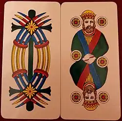 • Wild card (Italian): the king of coins (or, if playing with French-suited cards, the queen of hearts) is a wild card and may take the value of any other card at the discretion of the owning player, as long as the player has at least another card in their hand. If it is the only card in the player’s hand, it is only worth 12. When playing with this variant, it is usually required to shuffle the cards at the end of the hand the wild card was dealt in.