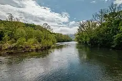 The park land is bounded on the eastern side by Powell Mountain in the Massanutten Mountain range and the George Washington and Jefferson National Forests, which provides visitors with additional outdoor recreation opportunities.[4] The park's western boundary is the Shenandoah River. The park lands along the banks of North Fork of the Shenandoah River generally consist of old floodplain terraces. Of the 1,066 acres of park land, approximately 234 acres (95 ha) are open fields that have been farmed as hay and row crops and are currently being maintained through agricultural leases.