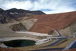 The contract for Seven Oaks Dam was awarded in 1994 and construction work began in May.[8] A system of conveyor belts totaling 3.5 miles (5.6 km), with a capacity of 3,400 short tons (3,080 t) per hour, was built to transport materials to the dam site. Fill used in the embankment was excavated from the Santa Ana River canyon directly below the dam, the alluvial fan of the river north of Mentone, and a cut in a ridge directly southeast of the dam that now serves as the dam's spillway. The dam was built in ten alternating zones of dirt, rock and clay that ultimately totaled 38,000,000 cubic yards (29,000,000 m3).[9] When completed and dedicated in January 2000, the Seven Oaks Dam was the 12th highest dam in the world and was one of the last major dams built in the United States.[10] At $450 million, the final cost of the dam significantly exceeded the USACE's projected cost.[1] The federal government shouldered 70.47% of the total cost, while Orange County paid 27.09%, San Bernardino County 1.71%, and Riverside County 0.73%.[11]