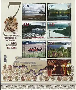 The Seven Natural Wonders of Ukraine (Ukrainian: Сім природніх чудес України, romanized: Sim pryrodnikh Tchudes Ukrainy) is the selection of the most popular and unique natural landmarks in Ukraine, as the second stage of the Seven Wonders of Ukraine national program. All seven sites are publicly owned protected areas of at least regional level, available for tourism.