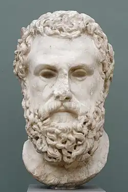 The first certain reference to the number of champions being seven, along with a list of their names, occurs in Aeschylus' Seven Against Thebes. This list contains all the names known from earlier sources, excluding Adrastus—who although present at the battle, is not considered by Aeschylus to be one of the "Seven"—while adding two new names: Eteoclus and Hippomedon.[28] The same list of names is given in Euripides' The Suppliants (where Eteoclus is said to be the son of Iphis), and Sophocles' Oedipus at Colonus (where Hippomedon is said to be the son of Talaus, and so the brother of Adrastus).[29] However, Euripides gives a slightly different list in The Phoenician Women, with Adrastus replacing Eteoclus, and this list will be followed by the Greek historian Diodorus Siculus, the mythographers Apollodorus and Hyginus (in the Fabulae), and the Latin poet Statius.[30] Hyginus says that Adrastus chose seven generals (including himself) because Thebes had seven gates.[31]