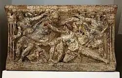 Theseus, having finally been persuaded to help Adrastus, leads an Athenian army to Thebes where—unlike in Aeschylus' Eleusinians in which he is able to accomplish his mission through diplomacy—he must defeat the Thebans in battle in order to bring back to Eleusis the bodies of the fallen warriors.[107] Five of the Seven are brought back, all except Amphiaraus, of whom it is said that "the gods by snatching him away alive, chariot and all, into the depths of the earth openly praise him", and so could not be brought back,[108] and Polynices, who presumably was buried at Thebes.[109] The rest of the Seven's army was buried by Theseus at Eleutherae a small village on the Attic side of Mount Cithaeron.[110]