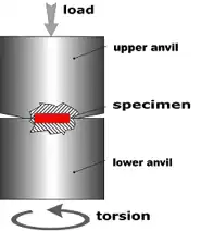 High-pressure torsion (HPT) can be traced back to the experiments that won Percy Bridgman the 1946 Nobel Prize in Physics, though its use in metal processing is considerably more recent. In this method, a disk of the material to be strained is placed between 2 anvils. A large compressive stress (typically several gigapascals) is applied, while one anvil is rotated to create a torsion force. HPT can be performed unconstrained, in which the material is free to flow outward, fully constrained, or to some degree between in which outward flow is allowed, but limited.[4]