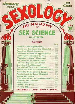 Sexology was a magazine about the practice of human sexuality, founded by polymath and publisher Hugo Gernsback. It was published in New York City between 1933 and 1983.[1] The magazine had a circulation of up to 200,000 at its peak,[1] and was also known under the titles Sexology Together and Sexology Today. At time of closure, the magazine was published by Medi-Media Publications.