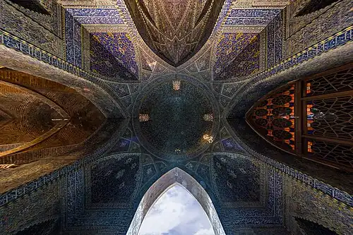 The plan and base of the Seyyed Mosque is generally a rectangular shape.[5] The mosque has two domes, the smaller, northeastern one over the mausoleum of Mohammad Bagher Shafti and his family.[3][6] The mosque has four main iwans leading to it, as well as a lot of corridors within the structure. The exterior of the mosque is enhanced with Qajar-era decorative tiling.[2][3][5][6]