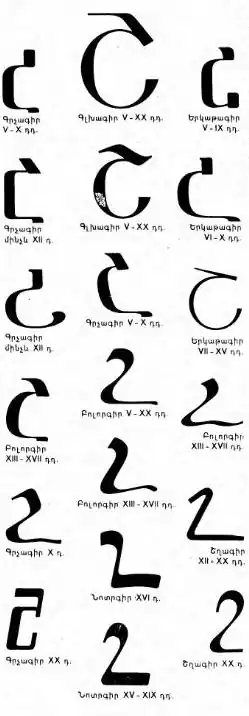Sha (majuscule: Շ; minuscule: շ; Armenian: շա) is the twenty-third letter of the Armenian alphabet, representing the voiceless postalveolar fricative (/ʃ/) in both Eastern and Western Armenian. It is typically romanized with the digraph Sh.[1] It was part of the alphabet created by Mesrop Mashtots in the 5th century CE. In the Armenian numeral system, it has a value of 500.[2] Its shape in lowercase form is similar to the Arabic numeral 2.