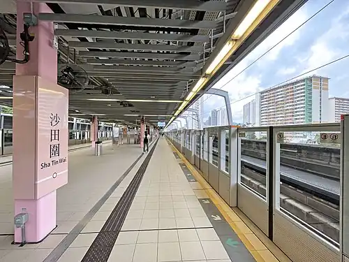 Sha Tin Wai (Chinese: 沙田圍; Cantonese Yale: Sātìnwài) is a station on the Tuen Ma line in Sha Tin, Hong Kong. The name "Sha Tin Wai" comes from the village called Sha Tin Wai, which is located to the northeast of the station. It was provisionally called "Sha Kok Street" before the Ma On Shan line opened, because it is located at Sha Kok Street.