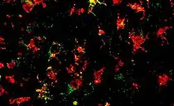 The inflammasome study conducted at the University of Queensland produced a promising new therapy to stop Parkinson's disease progressing through counteracting brain inflammation caused by immune cells.[28] The study primarily targeting ways to counteract immune cells, specifically the microglia which is highly activated in patients with Parkinson's disease by NLRP3 inflammasome. The NLRP3 inflammasome reacts to synuclein containing protein clumps by increasing inflammatory signals which contributes to the depletion of dopamine producing cells within the brain.[29] Whilst, recruiting more pathological proteins to create an intense cycle of neuroinflammation and a synuclein buildup within the brain.[29] The study found that a small molecule MCC950 administered orally once a day, stopped the development of Parkinson's disease in several animal models.[30] It was found to block NLRP3 activation within the brain and prevent both the loss of dopamine producing brain cells and neuroinflammation, resulting in significantly improved motor function - the leading symptom of parkinson's disease.[30] UQ Bioscience researcher Professor Matt Cooper stated that the "MCC950 molecule effectively 'cooled the brains on fire', turning down microglial inflammatory activity, and allowing neurons to function normally."[31]