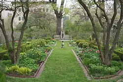 The Shakespeare Garden is located on the Northwestern University campus at the corner of Sheridan Road and Garrett Place, near the Howes Chapel and Garrett–Evangelical Theological Seminary.[2] The garden is 70 feet (21 m) wide by 120 feet (37 m) long and is divided into eight flower beds. The four outer beds are designed informally, while the four inner beds are knot gardens; the outer and inner beds are separated by boxwood plants. The borders of the garden are lined with hawthorn trees, many of which were imported from France when the garden was first planted.[3] The more than fifty varieties of plants in the garden were either mentioned in Shakespeare's works, common in the Tudor period in England, or are cultivars of plants in the other two categories.[3] The garden also includes a fountain with a plaque honoring Shakespeare and a stone memorial designed by Hubert Burnham, the son of architect Daniel Burnham.[4]