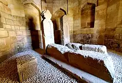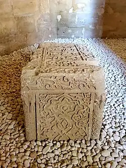 According to the local residents, Shahide-khandan (handsome merry man) was the nickname of Nasimi's brother, and the cemetery is named after him, since he was buried here.[2] In Shakhandan, the ruins of an octagonal mausoleum were discovered. Inside the mausoleum there are two graves, the headstone of one is slightly deepened into the ground. As a result of the atmospheric influences, the inscriptions were completely erased. On the reverse side of the deepened tombstone there is an image characteristic of the gravestones of Azerbaijan of the 14-15th centuries. The Azerbaijani archaeologist Huseyn Jiddi notes that this is probably the grave of "Shahide-Khandan" - Nasimi's brother. If this is true, then according to Jiddi, in the 14-15th centuries, the city's cemetery was located in this area. This is partly confirmed by other tombs of the 15th-16th centuries that are placed there. Many ancient gravestones of the cemetery have been lost, while some are underground.[2]