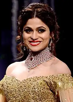 In 2016, Shetty walked the ramp during Lakme Fashion Week for Divya Reddy.[55] In 2017, she walked the India International Jewellery Week ramp for Surya Golds.[56] She also walked the ramp for Swarovski Gemstones at GJC NITE 2019.[57][58] In 2020, she was the showstopper for designer Priya Machineni's spring collection at Lotus India Fashion Week.[59][60]