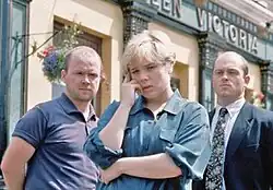 "Sharongate" is the term used for a storyline in the BBC soap opera EastEnders, which reached its climax on 24 October 1994, attracting 25.3 million viewers. The plot was written by EastEnders scriptwriter Tony Jordan.[1] In the storyline, Sharon Mitchell (Letitia Dean) confessed on tape that she had had sex with her brother-in-law, Phil (Steve McFadden). The truth comes out in the middle of The Queen Victoria pub. Sharon's husband Grant (Ross Kemp) attacked Phil and he was lucky to survive.