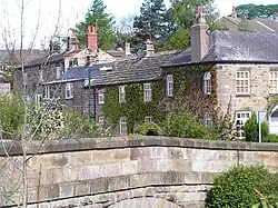 The village probably takes its name from a corn mill kept by one Robert Shaw in the 16th century.[2] In 1812 John and George Metcalfe began spinning flax in the Low Mill at Shaw Mills[3] The High Mill and Low Mill both closed by 1861, but in about 1890 were restarted for silk-spinning. The mills closed soon after the First World War.[4] An industrial settlement developed in the 19th century to serve the mills.
