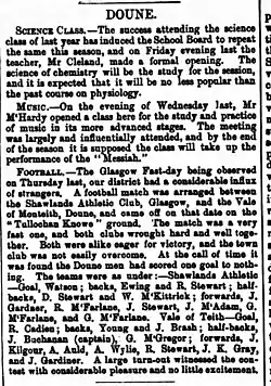 In the former, the club gained walkovers against both Clydesdale and Possil Bluebell to reach the third round, where the club was drawn to visit Clyde. As the Thursday before the third round tie was Glasgow fast-day, the club visited the Vale of Teith club in Doune for a warm-up match, losing 1–0.[4] Two days later the Athletic lost 4–0 at Clyde in a "very pleasant" game, Sloan scoring a hat-trick.[5][6]