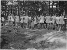 Men laboring in CCC camps were highly amused by the female counterpart. Writing for a CCC newspaper, one noted how little work women at Camp TERA did, adding, "Some of the girls are pretty. All are happy. They say they may never want to go back to New York, from where they came. Life has been tough for most of them."[16] Pauli Murray, who would later become a lawyer, writer, black civil rights activist, and episcopal priest, arrived at Camp TERA on the advice of her doctor at the end of 1933. Living on the edge of poverty and diagnosed with pleurisy, she found her time there cut short after she clashed with the camp's director, Miss Mills. An ambulance driver during World War I and an authoritarian, Mills attempted to run the camp on semi-military lines. Murray had a copy of Das Kapital in her bags and when director Mills found it, she ejected her from the camp. Murray would later become a close friend of Eleanor Roosevelt. The singing of leftist songs at camp sing-alongs became a focus of detractors. It was not surprising that there were leftists in the camps, given that they were not far removed from the "Hoovervilles", and the troubadour-style of fellow travelers like singer Woody Guthrie fueled these sing-alongs. It also was not surprising that in 1936 controversies over communist influences enveloped the camp. In July 1936, the American Legion of Rockland County accused Camp TERA officials of using Federal funding for communist purposes. The new Director, Bernice Miller, countered the charges, saying that "the campers were permitted the completest freedom to say and discuss what they wanted, and sing any songs they wanted to". She also was quick to add that most supported the government. As to complaints of the Internationale and radical satires being sung, and that controversial material was being read, some, Miller admitted were "of communist and socialist persuasion".[17] Also adding to embarrassment, women from Camp TERA "escaped" and visited a men's CCC camp nearby. A teacher at Camp TERA, Harry Gersh, commented, "It was a most unnatural environment for these women. No one had thought that sexual isolation would be a problem".[18][13]
