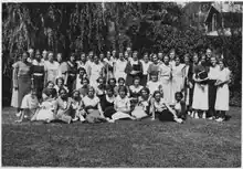 The Federal Emergency Relief Association (FERA) Camps, also called She-She-She Camps, were camps established in the United States to aid unemployed women by providing jobs and training. The camps were organized by Eleanor Roosevelt as a woman-focused counterpart to the Civilian Conservation Corps (CCC) programs which catered solely to unemployed men. Roosevelt found that the men-only focus of the CCC program left out young women who were willing to work in conservation and forestry and were prepared to spend the six-month program duration living away from family and close support. Therefore, she lobbied for a sister organization to the CCC that would cater to young women. Roosevelt proposed that this program would consist of camps for jobless women and residential worker schools. The FERA camps, referred to as She-She-She camps by certain detractors, were funded by presidential order in 1933.[1] Labor Secretary Frances Perkins championed one such camp after Roosevelt held a White House Conference for Unemployed Women on April 30, 1934, and subsequently Roosevelt's concept of a nationwide jobless women's camp was achieved. While the public largely supported New Deal programs such as the CCC, FERA camps reached a maximum of a little over 5,000 women annually by 1936, and overall served 8,500 as a result of Roosevelt's support.[2] This compares to more than 3 million men who participated in the CCC.[3]