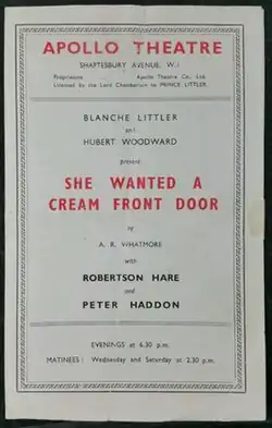 She Wanted a Cream Front Door is a 1947 comedy play by the British writer A.R. Whatmore.