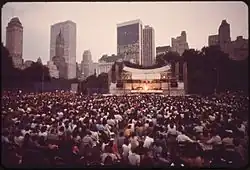 Other large gatherings included an event in 1969 when large crowds gathered to watch Apollo 11, the first crewed mission to land on the Moon.[14] That same year, a group of 15,000 to 20,000 people assembled in Sheep Meadow for a bonfire event.[28] This period was also marked by performances, such as a 1967 event where Barbra Streisand performed in front of 135,000 people,[78][79] as well as summertime concerts in Sheep Meadow that each drew tens of thousands of people.[78][80] Additionally, James Taylor's free benefit concert for the restoration of Sheep Meadow, hosted in July 1979, drew 250,000 people.[37]