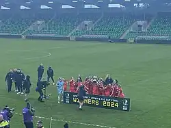 In 2022, the side went one better by securing the double. Facing Wexford away in a winner takes all final day decider, Shels strolled to a resounding 4:0 win to retain the WNL for the first time in their history.[25] The cup was subsequently secured with a 2:0 win over Athlone Town in front of a record FAI Women's Cup final crowd.[26]