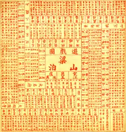 Shengguan Tu is typically played on a sheet of paper with six dice that are to be rolled in a bowl.[1] Boards come in two sizes: large and small, with the former naturally having more "charts" to indicate different bureaus than the latter.[1] The number of charts available ranges from 63 to 117.[16] Each player is represented by a main token, alongside two other mandarin tokens.[17] Each player starts off with 120 cash in tokens[17] and as a student in China's imperial examination system who is able to rise up the ranks with the roll of the dice; ranking promotions or demotions arbitrarily correspond with the value rolled, and is dictated by a rules booklet available for reference during gameplay.[3] Additionally, players who incur demotions have to pay fines.[13] However, the game also includes the element of corruption; favours and titles can be bought, and the rules permit players to receive "donations".[13] Since at least the Qing dynasty, there has been no universal standard of Shengguan Tu rules.[18] Furthermore, the written instructions provided on one version of the board obtained by Carole Morgan often "contradict each other" and have to be "supplemented by orally transmitted rules".[19]