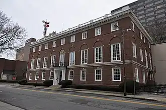 In 1913 architect George F. Shepard established an independent architectural firm in Boston. In 1921 he formed the partnership of Shepard & Stearns with Frederic B. Stearns, who had been an associate of the firm since its founding.[1][2] In their time most of the early work of the firm, such as the Phi Beta Epsilon fraternity house (1916) in Cambridge,[3] the Louis A. Coolidge house (1918) in Milton[4] and the Walter Baker & Company office building (1919) in Lower Mills, was credited to Shepard alone.[5] An exception was the Suburban Club (1914, NRHP-listed) in Stamford, Connecticut, for which Stearns was principal architect and which was credited to both. They designed the Suburban Club in the Federal variant of the Colonial Revival style then popular for American gentlemen's clubs.[6]