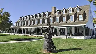 Designed in the style of hotels which Kimball had seen in Scotland, the three-story, wood-frame inn is 145 feet long under a gambrel roof, with broad porches 30 feet wide on two sides. The porches were designed with a gradual slope so that rainwater would run off. The hotel had 64 bedrooms on the second and third floors, each with its own dormer window. The large dining room sat up to 160 guests. The barns and livery stable associated with the Cody Transportation Company were at the rear of the property, but no longer survive.[4] He ran a stage line between the inn and Deadwood, South Dakota. The inn was listed on the National Register of Historic Places when it was established in 1966.[2][4]