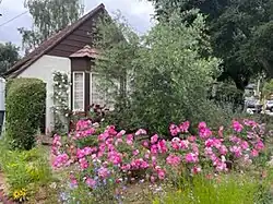 Although Tudor revival homes incurred greater expense to manufacture, they were popular and built in all sizes, including sprawling mansions and small cottages.[3] Most Tudor Revival homes, however, were large manors built in upscale neighborhoods. While the majority of Tudor Revival homes are located in the Northern United States since their facade is ideal for colder climates, the style did become popular in certain parts of Southern California, including such neighborhoods as Hancock Park and Windsor Square in the Wilshire District of Los Angeles. By the 1920s, Los Angeles became a mecca for aspiring craftspeople and artists, lured there by the motion pictures industry.[4] Flush with new wealth, movie moguls and stars sought luxurious living quarters befitting their new status, engendering an abundance of unique architectural revival styles in Los Angeles. Expansive, idealized versions of everything from Mediterranean villas to Spanish Missions and Greek Revival homes emerged. Storybook cottages provided a notable exception to the generous size generally required for revival architecture. Storybook cottages gained popularity in Southern California, though were rarely found anywhere else in the United States.[5] Although the building permit for this house did not require, hence did not list, an architect to be designated, it was most probably designed by the builder, Jack Frith. Frith acted as architect for a similar house in Tujunga, which he built as his own residence.[6]