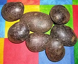 Shetland Black is a dark purple heritage variety of potato.[1] It comes from the Shetland Islands,[2] and was developed in the Victorian era, though the exact origin remains unclear. It is part of the United Kingdom Ark of Taste.[3] The plant grows to about 2.5 feet (0.76 m) tall and is shallow-rooted, making it suitable for container growing.[4] The potato is suitable for roasting, baking or steaming, and is commonly fried into chips or crisps.[3] The potato is fairly small compared with modern cultivars, and when sliced has a purple ring near the edge.[5] When cooked, it develops a fluffy, floury texture.[6]