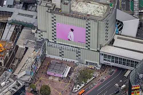 In 2013 and 2014, Shibuya station underwent major renovations as a part of a long-term site redevelopment plan.[12] Older buildings, such as the former main station building that previously housed the Tokyu department store, has been closed and demolished.[13] The Shibuya Hikarie building, also owned by the Tokyu Group, opened in 2012 and contains department store retail, restaurants, and offices.[14]