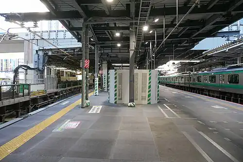 JR East is in the process of rebuilding the station, with reconstruction work starting in earnest in fiscal year 2015.[15] On 3 January 2020, the Ginza Line platforms were shifted about 50 meters (164 ft 1 in) east of the old platforms.[16] On 1 June 2020, the Saikyo Line platforms were shifted about 350 meters (1,148 ft 4 in) north of the old platforms, and now sits right next to the Yamanote Line platforms.[17] Major widening work took place on the Yamanote Line inner circle platform (Platform 2) on 23–24 October 2021.[18] As a result, Yamanote Line service was suspended between Ikebukuro and Osaki.[19] Effective the timetable revision on 18 March 2023, through services onto the Sagami Railway commenced courtesy of the Tokyu and Sotetsu Shin-yokohama Line.[20]