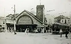 On 1 March 1885, Shibuya Station first opened as a stop on the Shinagawa Line, a predecessor of the present-day Yamanote Line. The Shinagawa Line was opened by the Nippon Railway. The station in its first years had little usage by passengers, with 16 to 17 people using the station every day on average. The Shinagawa Line itself was initially single-tracked, and the station was serviced by two-car formations making three return trips. Usage increased from 1887, when locals began to realize the convenience of railways.[2] The Nippon Railway was later nationalized in 1906 under the Railway Nationalization Act.[3] The station was later expanded to accommodate the Tamagawa Line, now a section of the Setagaya Line, in August 1907. The Tokyo Toden extended to the station in August 1911. The station building was rebuilt with the one that has a clock tower in 1916. The station was also elevated around this period. The Tamagawa Electric Railway opened the Tenngennji Line which terminates at the station in 1922. The station continued to service additional lines, with the station servicing the Toyoko Line operated by the predecessor of Tokyu Corporation from 1927, and the current Inokashira Line in 1933.[4] The Tokyo Metro Ginza Line opened and began serving the station in 1938. Developments in the area around Shibuya Station paused during the World War II.[2]