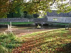 Traditional houses and cottages in Shilton are built of local Cotswold stone. Shilton House was built in 1678[10] and is a Grade II* listed building.[16] Elm Farm dates from 1683.[10] Shilton Bridge across Shill Brook is a small stone hump-back bridge that was probably built in the 18th century.[17] By the 1930s its stonework had become decayed, it was too narrow for modern traffic and its hump was too acute for some vehicles.[18] In 1938 Oxfordshire County Council rebuilt the bridge, making the road across it wider and reducing the hump.[18] The sides of the bridge were rebuilt using the original stones in their original relative positions as far as possible, while the widening of the bridge was achieved by inserting a concrete section in the middle of the road hidden from view.[18]