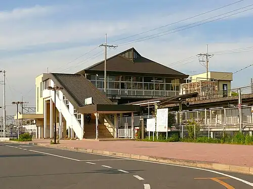 This station has an elevated station building with two opposed ground-level side platforms underneath, serving three tracks. The station is staffed.