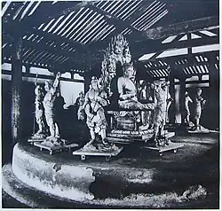 The 191.5 cm, Heian period seated Yakushi Nyorai is the principal image of Shin-Yakushi-ji. He is placed on a huge (9 m diameter, 90 cm high) circular platform (Dais) which almost entirely fills the Hon-dō.[7] Together with six small Buddha images (化仏, kebutsu) on its halo, the main statue forms a group of Seven Buddhas of Healing (七仏薬師, shichibutsu yakushi). Yakushi Nyorai is protected by Twelve Heavenly Generals arranged in a circular fashion around it facing outward.