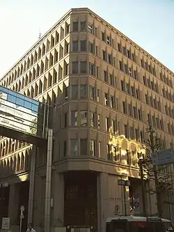 The Tokyo air raids from May to August 1945 destroyed almost 90% of the buildings in the area in and around Shinjuku Station.[6] The pre-war form of Shinjuku and the rest of Tokyo was retained after the war because the roads and rails, damaged as they were, remained, and these formed the heart of Shinjuku in the post-war construction. Only in Kabuki-cho was a grand reconstruction plan put into action.[7]