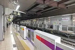 Later, when the Keio 1000 series trains were introduced, which had 20-meter cars, the platform was extended by construction into the tunnel, and starting on September 28, 1995, all doors on trains stopping at the station could open. During the period when the doors would not open, on the inside of the tunnel outside the unopening doors was written the words, "The doors here do not open" (ここではドアがあきません, Koko dewa doa ga akimasen).